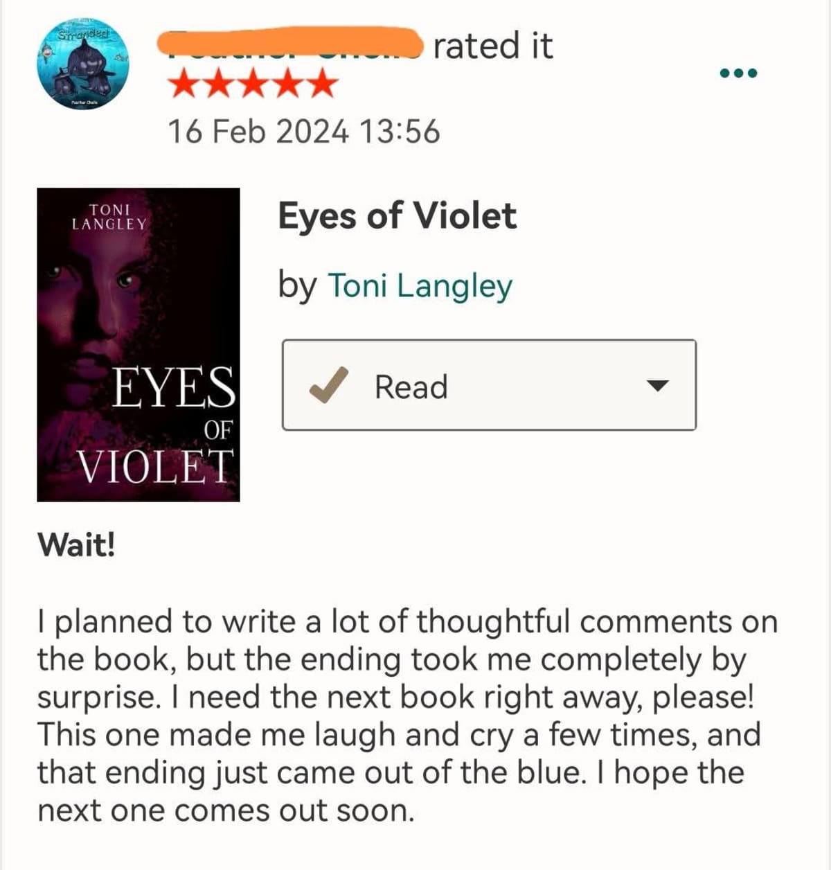 "I planned to write a lot of thoughtful comments on the book, but the ending took me completely by surprise. I need the next book right away, please! This one made me laugh and cry a few times, and that ending just came out of the blue. I hope the next one comes out soon."