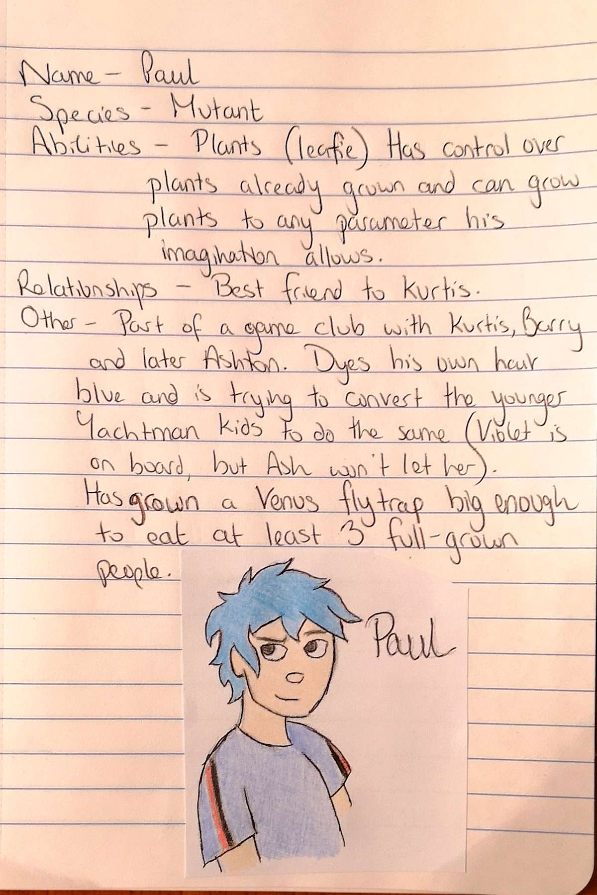 Other- Part of a game club with Kurtis, Barry and later Ashton. Dyes his own hair blue and is trying to convert the younger Yachtman kids to do the same (Violet is on board, but Ash won't let her). Has grown a Venus flytrap big enough to eat at least 3 full-grown people.