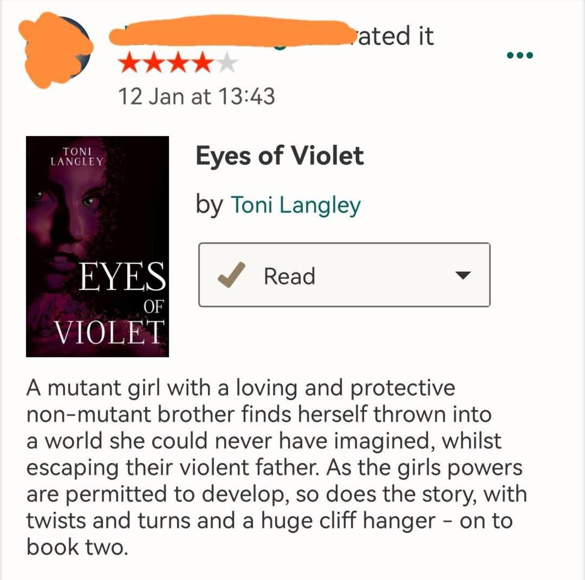 "A mutant girl with a loving and protective non-mutant brother finds herself thrown into a world she could never have imagined, whilst escaping their violent father. As the girls powers are permitted to develop, so does the story, with twists and turns and a huge cliff hanger - on to book two."